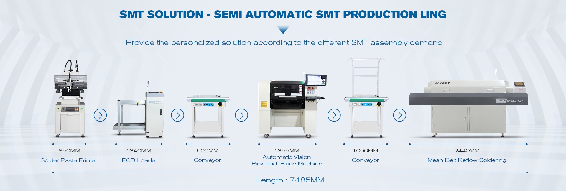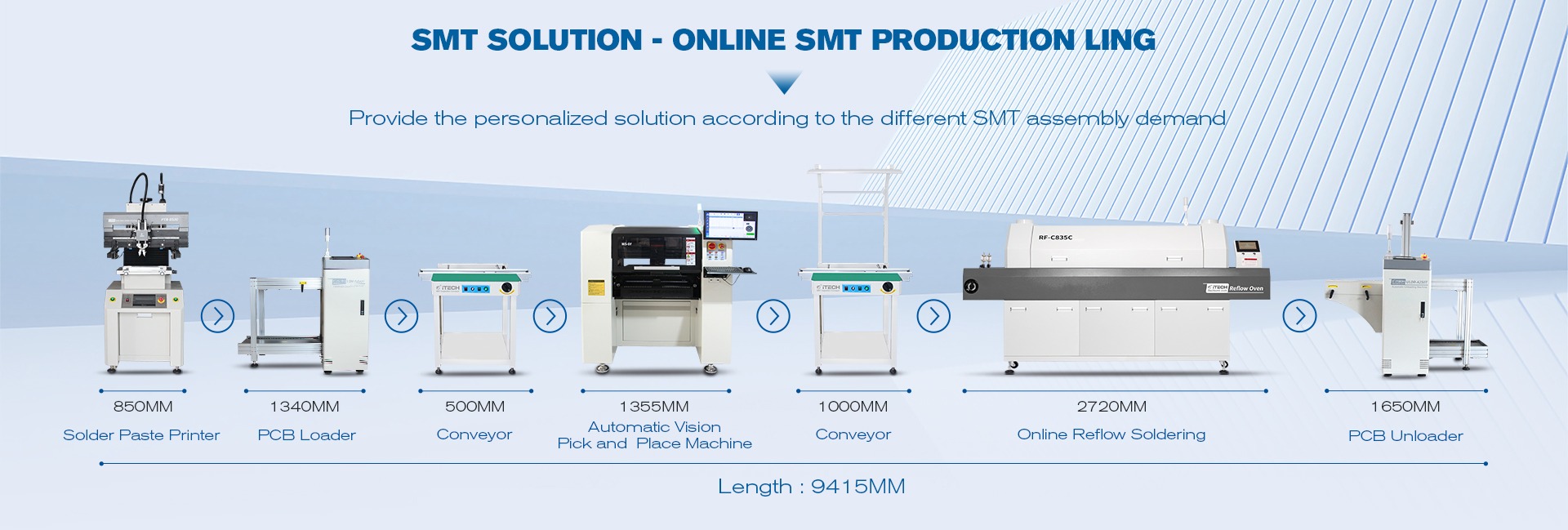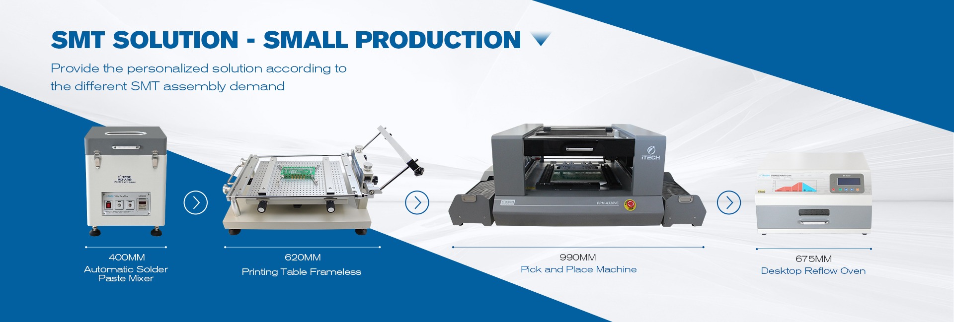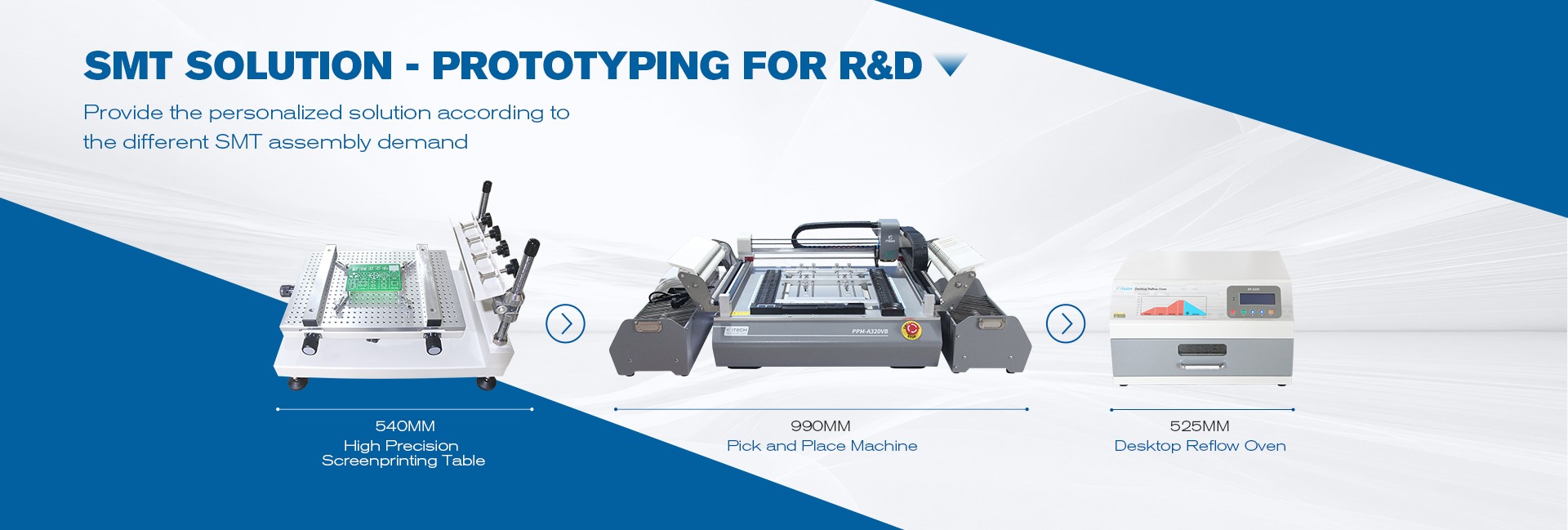 मुख्य उत्पादों: पिक और जगह मशीन; रीफ्लो ओवन; सोल्डर पेस्ट प्रिंटर; pcb हीटिंग प्लेट; सोल्डरिंग बर्तन